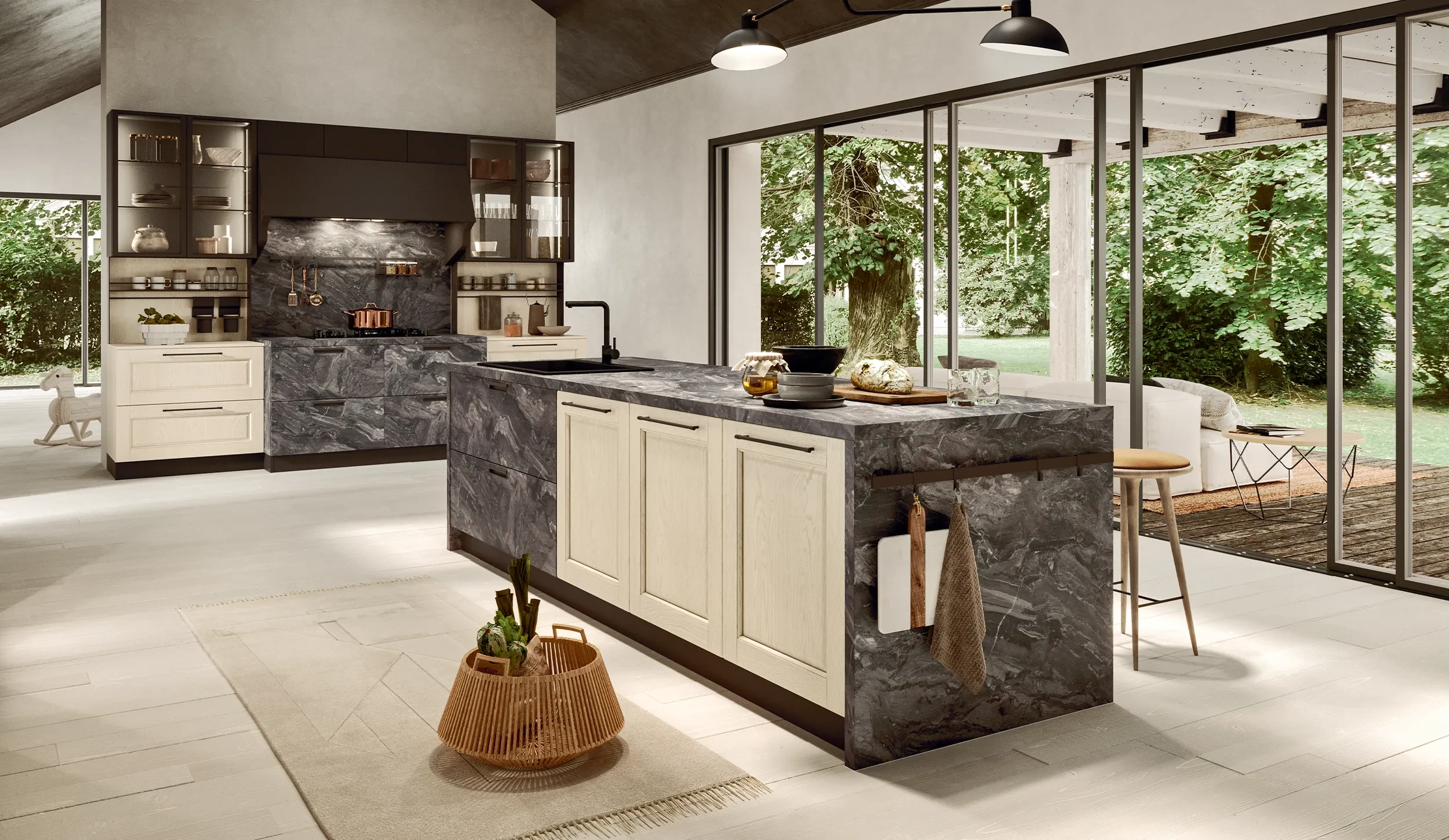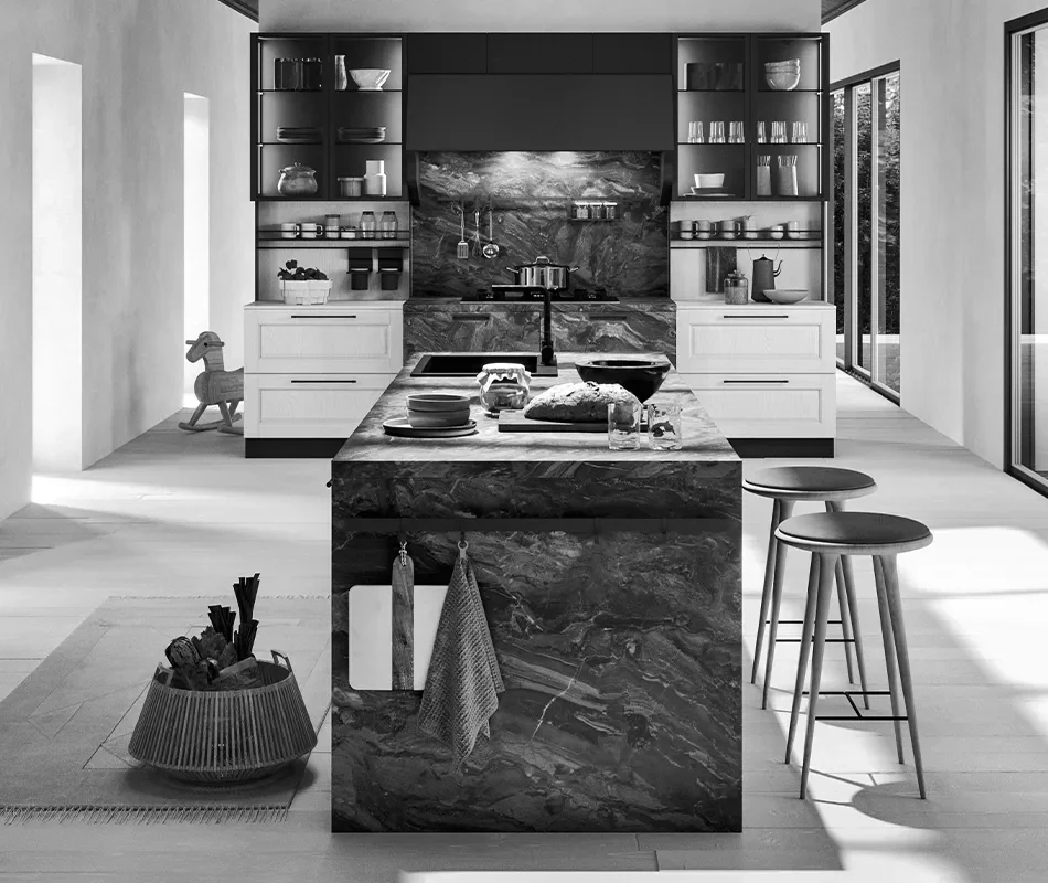Les poignées peuvent être formées d’une seule coulée de métal, comme la poignée « Tondino » présentée dans cette composition, ou bien elles peuvent être accompagnées d’inserts en céramique qui leur sont joints. Les charnières à freinage BLUM, disponibles de série, permettent d’apprécier la fermeture douce et silencieuse de toutes les façades de la cuisine, jour après jour.