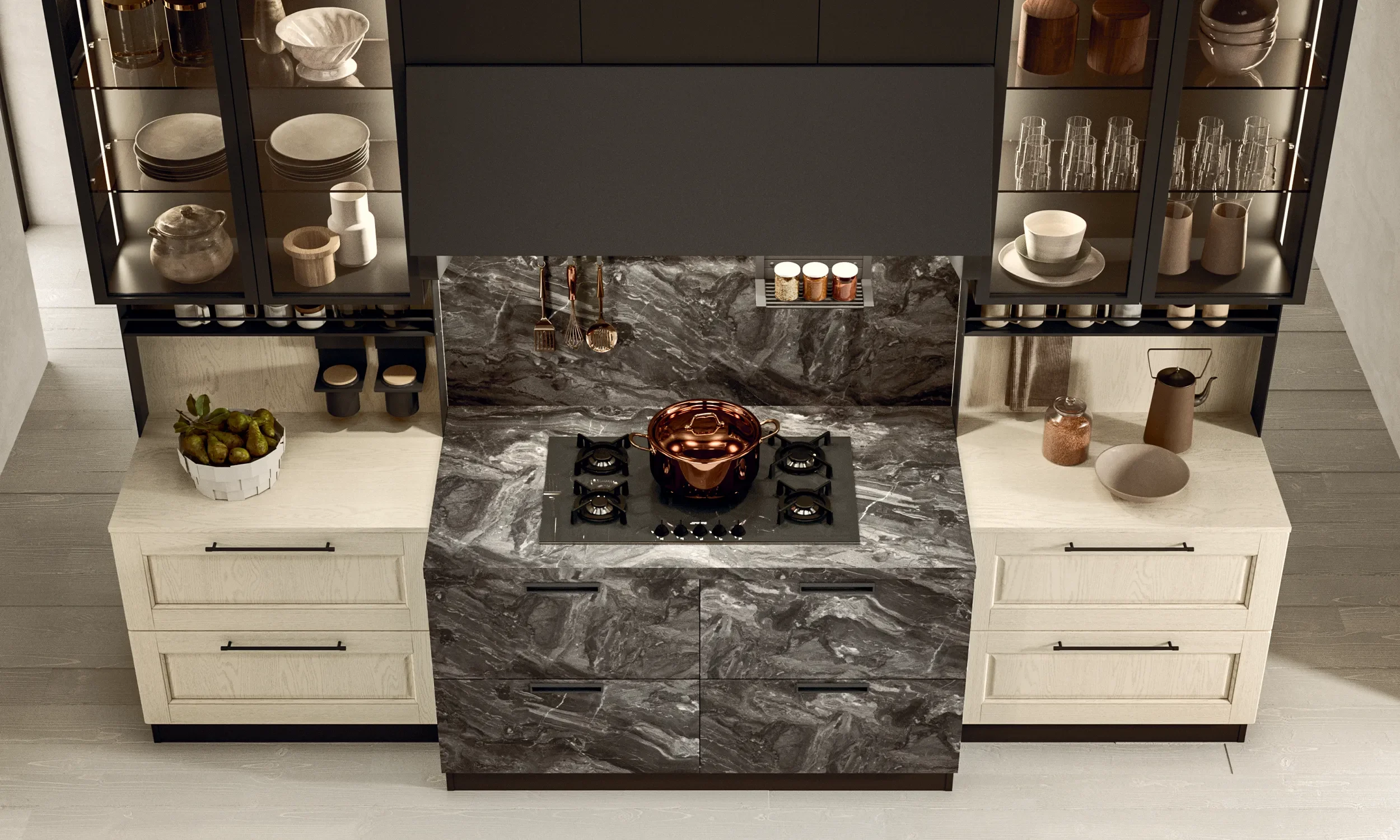 Sous la grande table de cuisson de 90 cm se trouvent deux bases avec des paniers de 75 cm de large chacune et personnalisées avec la discrète poignée encastrée Accakappa.